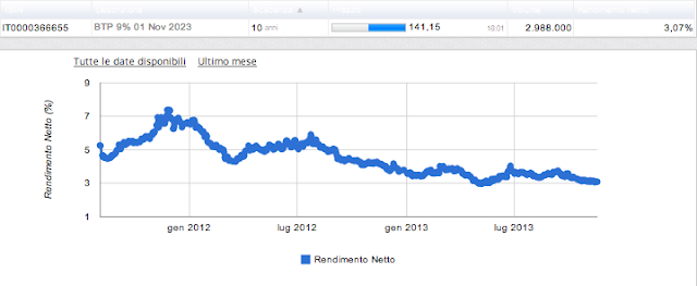 Mentre sto scrivendo, il rendimento di un Btp decennale, scadenza Novembre 2023, porta un rendimento del 3,07 (fonte: rendimentobtp.it).